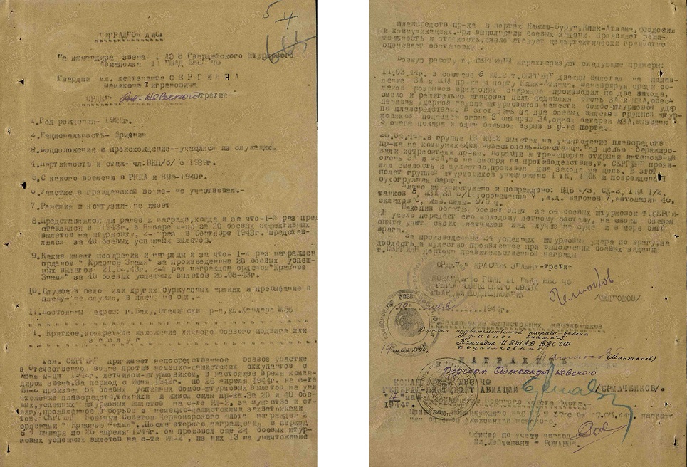 - Наградной 17 мая 1944 г. М.Т. Сергияна на Орден Александра Невского