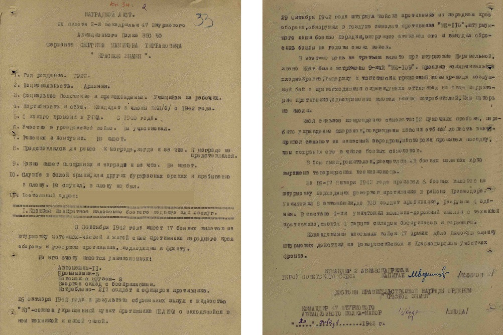 За произведенные 24 успешных штурмовых ударов по врагу, за доблесть и мужество, проявленные при выполнении боевых заданий, т. Сергиян достоин правительственной награды Ордена «Красное Знамя» – третий.