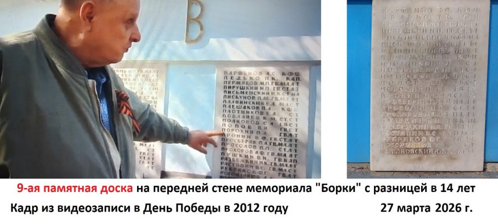 Для наглядности приводим один кадр (36:06) из видеозаписи мероприятия в Борках в День Победы в 2012 году. На нём 9-ая по счету (после плит с именами ГСС) памятная доска на передней стене мемориала. Можно сравнить как это выглядело 14 лет назад и сегодня.