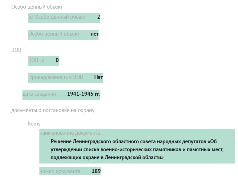- Решение Ленинградского областного совета народных депутатов «Об утверждении списка военно-исторических памятников и памятных мест, подлежащих охране в Ленинградской области» – 1988-05-16, номер документа – 189