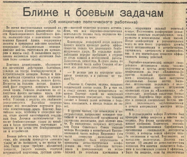 Партийно-политический аппарат гвардейского штурмового полка хорошо подготовил и другую летно-тактическую конференцию на тему «Ильюшины-2» против кораблей противника». Во всех эскадрильях были выпущены специальные боевые листки. Бывалые штурмовики поделились с молодыми летчиками опытом штурмовки вражеских судов на «Ильюшиных», обстоятельно разобрали различные боевые эпизоды. Партийное бюро полка, организуя и проводя специальные беседы, широко пользовалось опубликованными в печати материалами мастеров штурмовки.