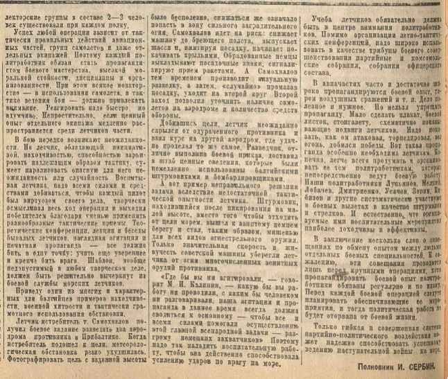 Успех любой операции зависит от тактически правильных действий авиационных частей, групп самолетов и даже отдельных экипажей. Поэтому каждый политработник обязан стать пропагандистом боевого мастерства, высокой моральной стойкости, дисциплины и организованности. При этом всякое новаторство – в использовании самолета, в тактике ведения боя должно привлекать внимание. Реагировать надо быстро, но вдумчиво. Непростительно, если ценный опыт отдельного экипажа медленно распространяется среди летчиков части.