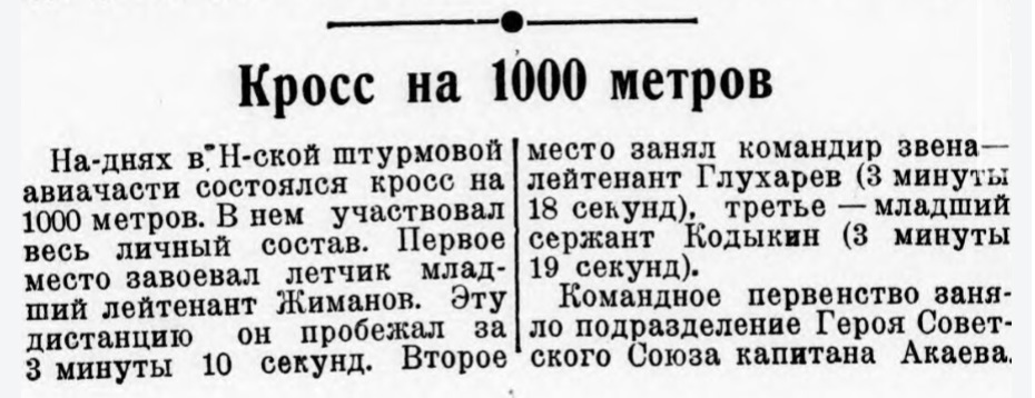 На-днях в Н-ской штурмовой авиачасти состоялся кросс на 1000 метров. В нем участвовал весь личный состав. Первое место завоевал летчик младший лейтенант Жиманов. Эту дистанцию он пробежал за 3 минуты 10 секунд. Второе место занял командир звена— лейтенант Глухарев (3 минуты 18 секунд), третье младший сержант Кодыкин (3 минуты 19 секунд).