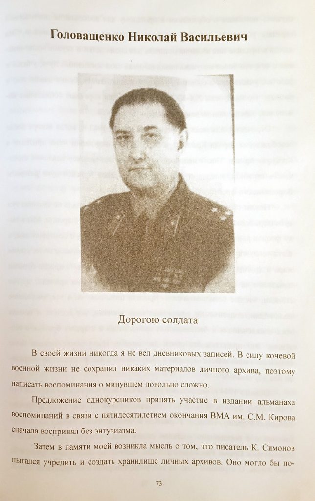 В 2006 году Военно-медицинская академия им. С.М, Кирова (Санкт-Петербург) издала сборник воспоминаний “Юбилейная встреча выпускников 1956 года”. Среди 43 рассказов был и от Николая Васильевича Головащенко (с. 73-80).