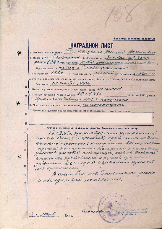 Отрочество для меня закончилось 4 апреля 1943 г., когда вскоре после освобождения города Краснодара от немецкой оккупации меня призвали в Красную Армию. После недолгой подготовки, без навыков владения стрелковым оружием, эшелоном был направлен в район Курской дуги резервом Воронежского фронта.